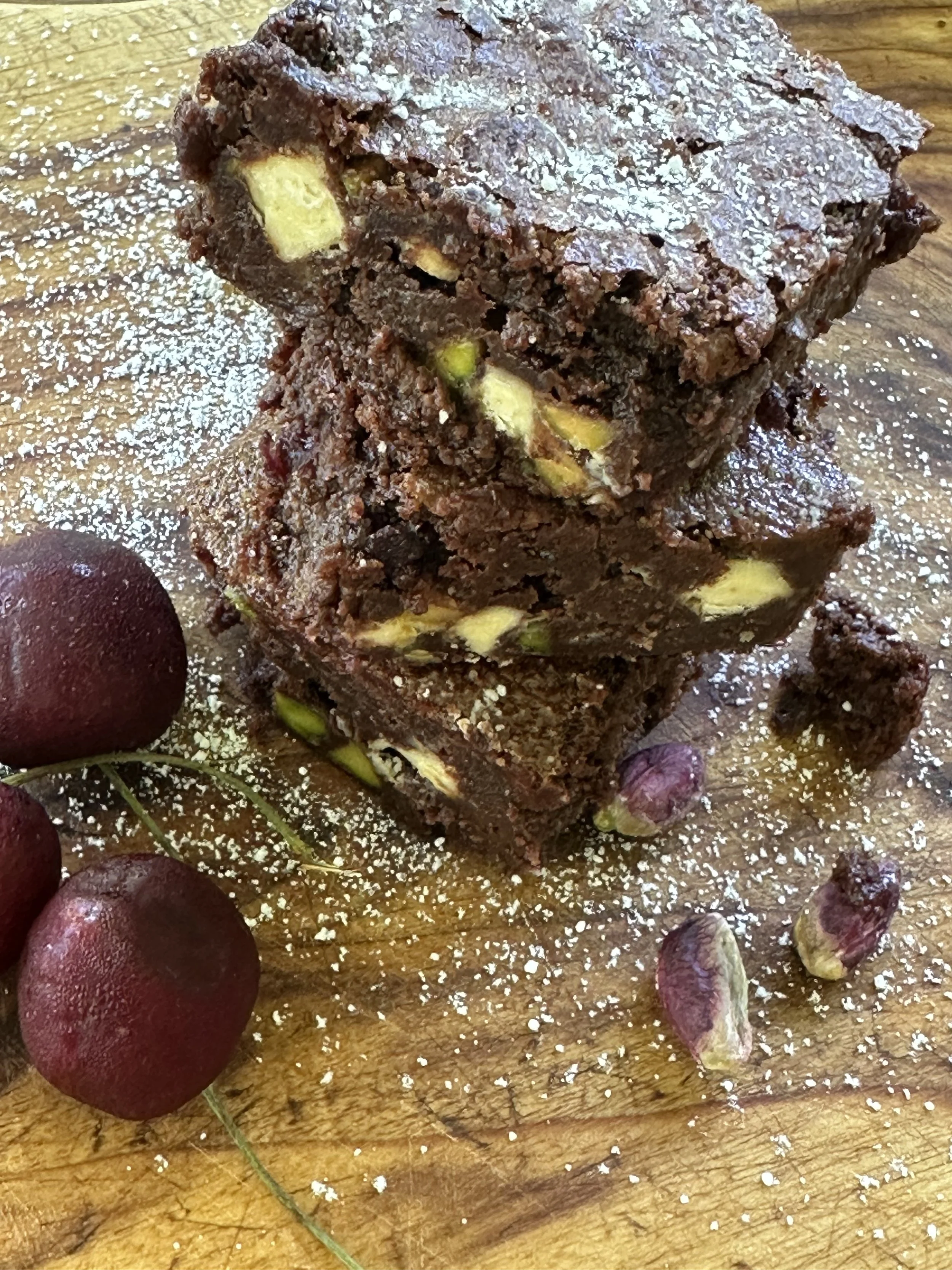 Bake for 27 minutes. It should look shiny and slightly cracked when cooked. Don’t put a skewer in to test, as its meant to be a fudgy consistency, not cake like.